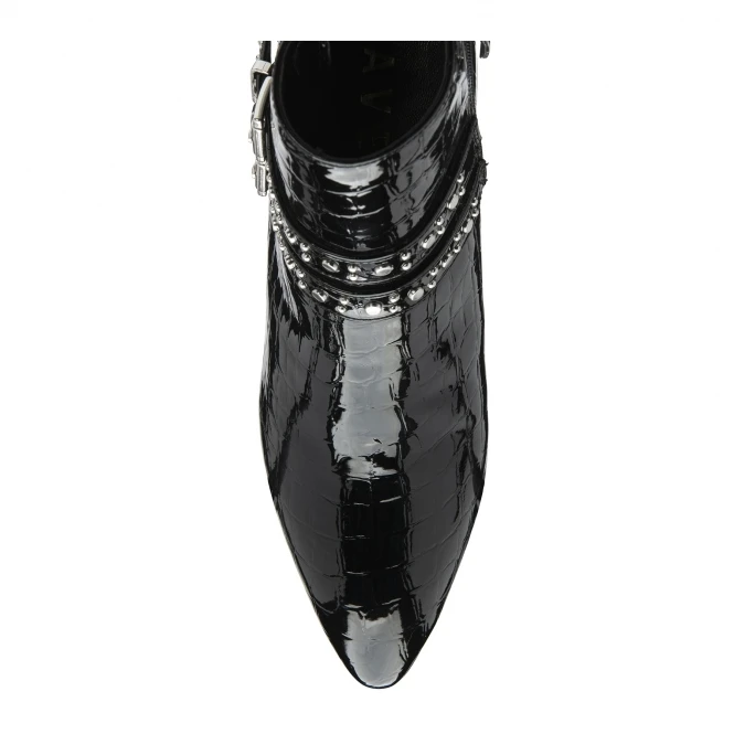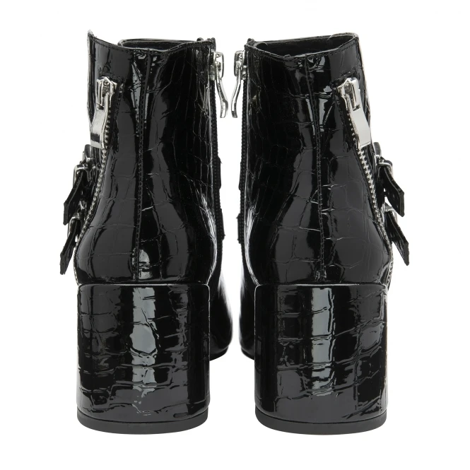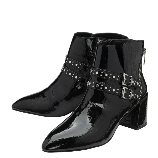 Step out in statement style with Ravel’s Ruby ankle boot. This women’s boot showcases a shiny moc-croc embossed design and fitted with a pointed toe. Ruby is set on a chunky 6.5cm block heel and has a side zip fastening. This Ravel ankle boot also features twin straps adorned with studs and decorative buckles. Team Ruby with a midi dress and leather jacket for a casual evening look.Â