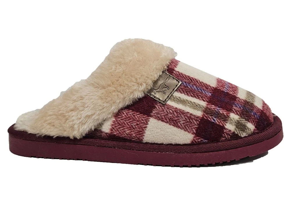 Jo & Joe Shetland Cherry Combi Tartan Fleece Lined Warm Mule Comfort Slippers Burgundy