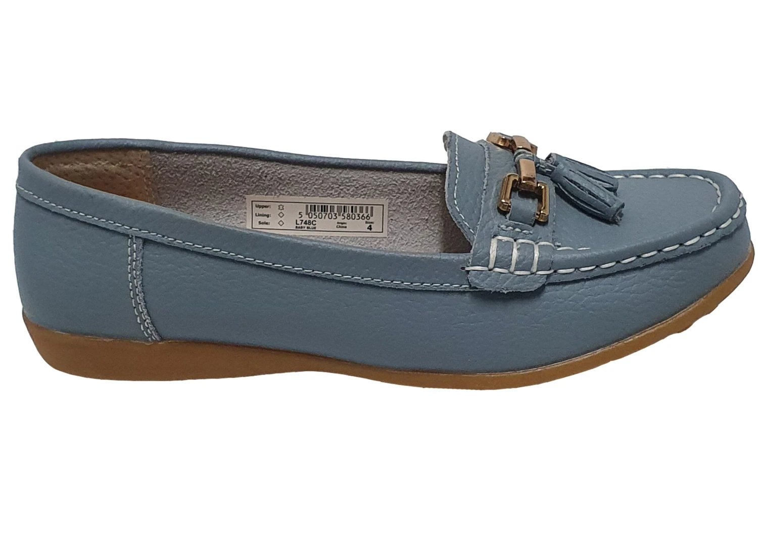 Womens Light Blue Leather Comfort Insole Summer Tassle Loafers Flat Shoes